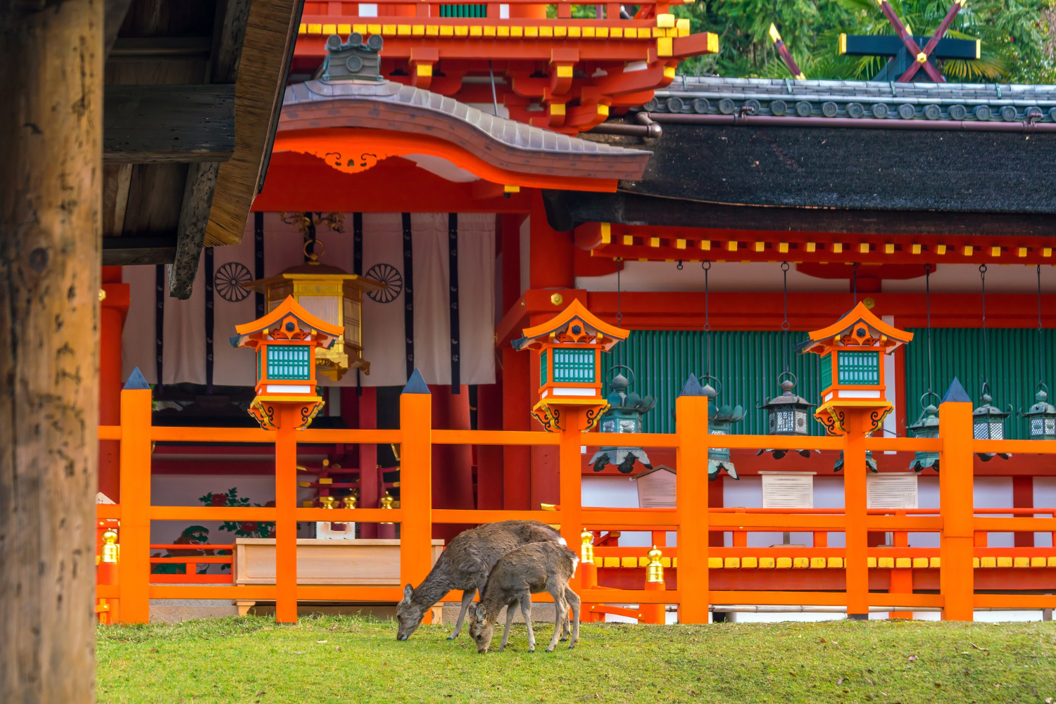 - Visite du sanctuaire Kasuga aux bâtiments laqués de rouge, célèbre pour son allée aux trois milles lanternes de pierre. Dédié aux ancêtres divins et mythiques de la famille Fujiwara, il est situé au pied d’une colline, en lisère du parc où errent les daims sacrés